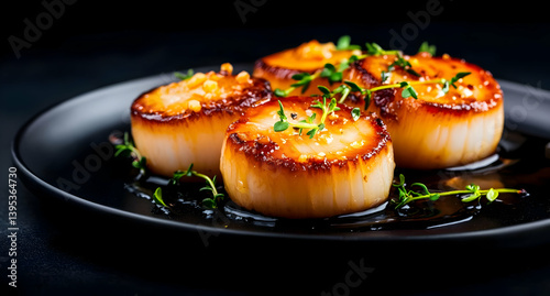 A plate of beautifully seared scallops garnished with fresh herbs, showcasing an elegant and appetizing culinary presentation.