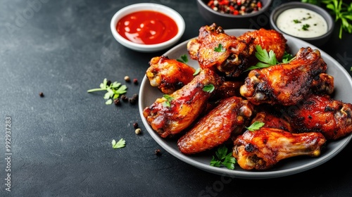 chicken, wing, bar-b-q, grilled, saucy, sauce, red, glaze, delicious, crispy, juicy, food, dinner, snack, party, eat, savoury, meat, poultry, finger, food photography, table, plate, black, background, dark, rustic, closeup, overhead, isolated, studio, tasty, deliciously, appetising, bar-b-q, side dish, american, cookery, fast food