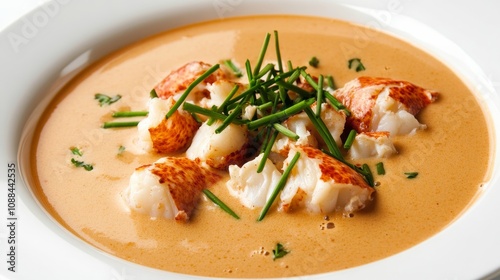 plate, creamy, lobster, soup, garnished, chunk, chives, each, spoonful, filled, rich, luxurious, favor, seafood, indulgence, highlighted, isolated, white, background