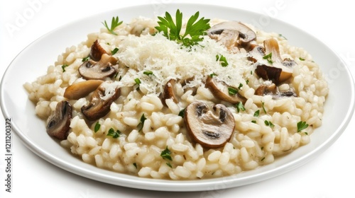 plate, creamy, mushroom, risotto, rice, assorted, mushroom, parmesan, cheese, fresh, herb, each, spoonful, indulgent, flavorful, italian, comfort, food, classic, highlighted, isolated, white, background