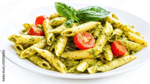 plate, creamy, pesto, pasta, penne, cherry, tomatoes, spinach, basil, sauce, each, bite, indulgent, flavorful, italian, comfort, food, classic, highlighted, isolated, white, background