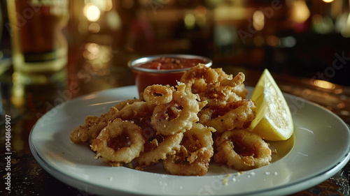 A plate of crispy calamari served with marinara sauce and a lemon wedge for dipping