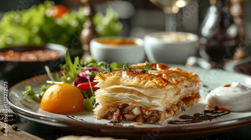 A plate of Fiteer with layered pastry, cheese or meat filling, served with salad or dipping sauce in an elegant restaurant setting