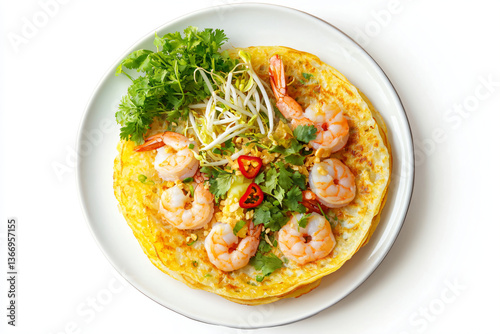 food, cookery, eating, closeup, ingredient, omelet, shrimp, herb, cilantro, bean sprouts, plate, garnish, delicious, savoury, yellow, fresh, dish, asian cuisine, epicure, meal