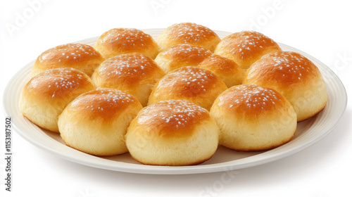 A plate of freshly baked rolls, soft and fluffy texture, colored in golden orange hues, slightly glossy surface, arranged neatly on an off-white ceramic plate, white background with clear subject sepa