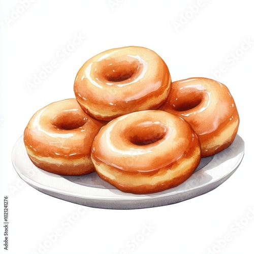 A plate of glazed doughnuts stacked together, showcasing their shiny surface and soft texture, inviting a sweet treat for any occasion. watercolor, clipart, isolated on white background.