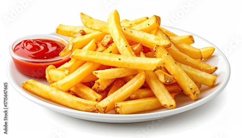 fries, french, potato, gold, crispy, seasoned, ketchup, sauce, plate, white, food, dish, eatery, meal, snack, tasty, delicious, appetising, hot, ready, eat, comfort, carb, side, savoury, spiced, potato, vegetable, fast, easy, lunch, dinner, deliciously, homemade, honed