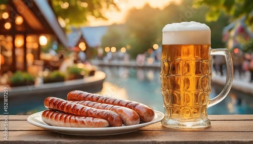 plate, grilled, sausage, mug, beer, wooden table, setting, food, drink, meal, refreshment, bar-b-q, summer, cookout, delicious, cooked, cookery, german, traditional, dinner, tasty, glasses, frothy, evening, sunset, beer garden, eatery, sausage, bar-b-q, pub, dining, meat, beverage, lager, foam, cold, background, copy space, ai, generated
