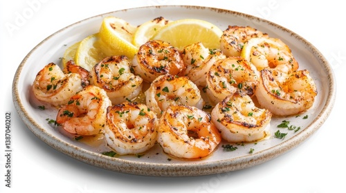 A plate of grilled shrimp with garlic butter and lemon wedges. Featuring flavor and freshness