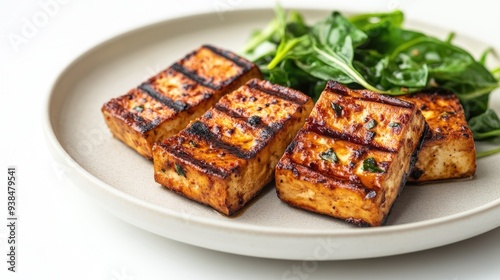 A plate of grilled tofu with a side of steamed greens on a white background, with space for promotional content.