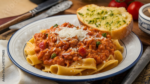 pappardelle, bolognese, sauce, rich, parmesan, cheese, grated, garlic, bread, plate, pasta, savoury, ai, delicious, hearty, italian, topping, comforting, flavorful, warm, classic, satisfying, tender, indulgent, slice, epicure, aromatic, creamy, meal, elegant, dish, fresh, serving, delectable, robust, gold