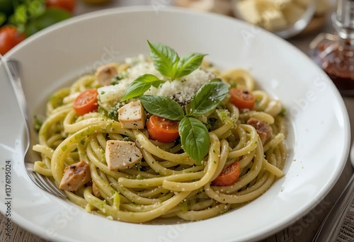 pasta, food, spaghetti, meal, dish, plate, italian, dinner, noodle, sauce, cookery, tomatoes, lunch, epicure, delicious, basil, vegetable, white, shrimp, salad, healthy, seafood, meat, green, cooked