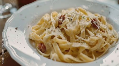A plate of pasta with crispy bacon and melted parmesan cheese