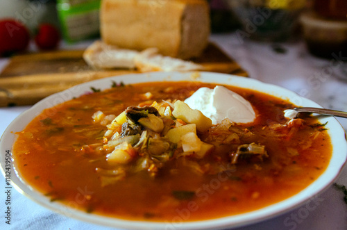 soup, bowl, broth, cabbage, closeup, carrot, cooked, cookery, delicious, diet, dinner, dish, food, boiled, fresh, epicure, healthy, homemade, hot, kitchen, meal, meat, nourishment, plate, potato, red, russian, rustic, spice, table, tasty, tomatoes, traditional, vegan, vegetable, vegetarian, wooden, bread