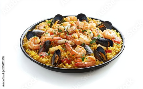 A plate of seafood paella bursting with shrimp, mussels, and saffron rice, isolated on white