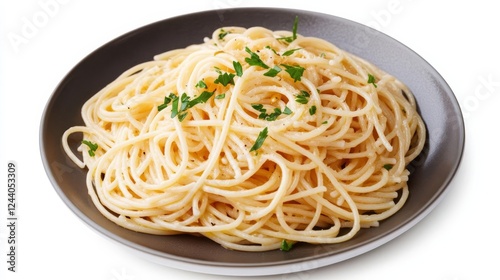 A plate of spaghetti aglio e olio, minimalist Italian dish, hyper-realistic details, soft golden hues, isolated on white background