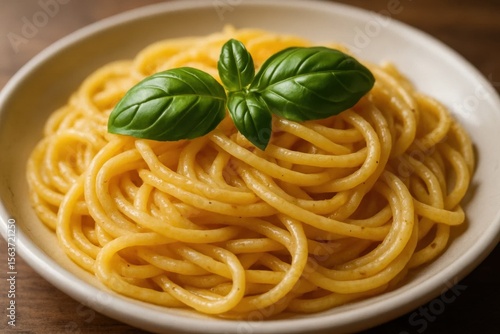 A plate of spaghetti with a basil leaf on top