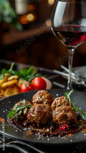 A plate of Spanish albondigas with a glass of red wine