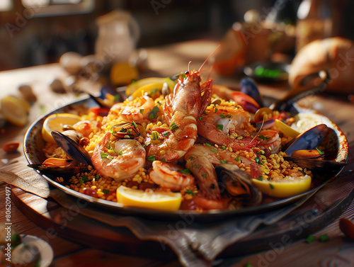 spanish, seafood, paella, wooden, table, morning, light, food, dish, rice, spain, dinner, saffron, cooked, prawn, shrimp, cookery, mussel, meal, tradition, fish, vegetable, seafood, lemon, epicure, eatery, mediterranean, prepared, squid, plate, spice, pan, closeup, healthy, delicious, lunch, rustic, fresh, parsley, pepper, serving, receipe, herb, gastronomy, orange, culinary, clam, paprika, eating