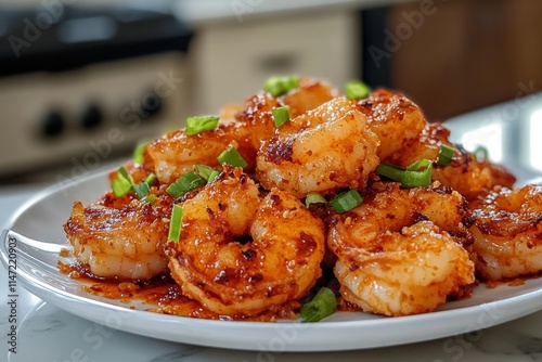 shrimp, seafood, spicey, food, plate, garnish, green, onion, cookery, meal, dish, cooking, favor, ingredient, presentation, dinner, lunch, receipe, culinary, delicious, fresh, tasty, vibrant, colours, dining, epicure, chef, eatery, kitchen, heat, texture, aroma, savoury, enjoyment, feast, nourishment, protein, seafood, indulgence, style, elegance, life events, culture, eating