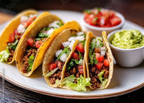 A plate of tacos with ground beef, lettuce, and cheese, with tomato sauce and guacamole on the side, against a white background