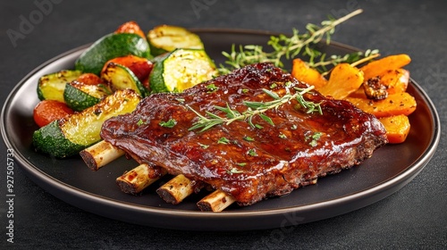 A plate of tender, slow-roasted beef ribs, with a caramelized crust and a side of roasted vegetables