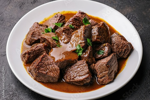 A plate of tender, succulent beef chunks in rich gravy, garnished with fresh parsley, presenting an appetizing dish perfect for meat lovers.