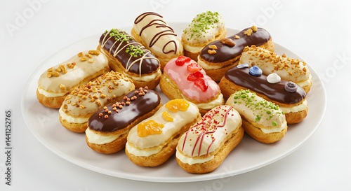 A platter filled with an assortment of eclairs featuring various toppings and different flavor combinations