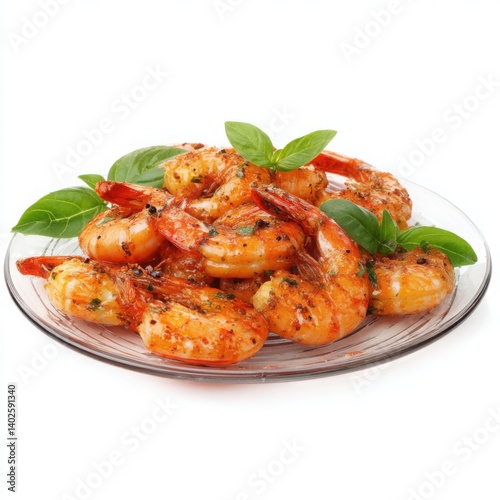 A platter of delicious cooked shrimp, garnished with basil,