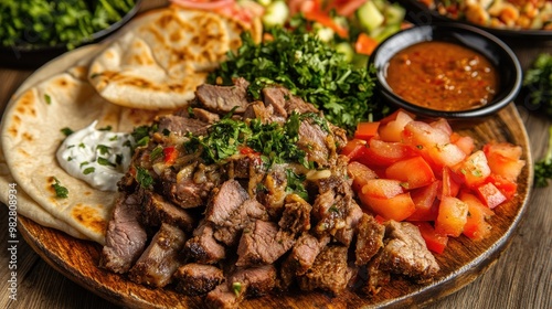 A platter of Lebanese shawarma, with marinated meat, fresh vegetables, and pita bread, served with a side of garlic sauce.