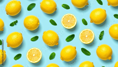 pattern, surface, design, creative, playful, summer, lemonade, mint, leaf, fresh, sun, yellow, wallpaper, fruit, sour, juicy, blue
