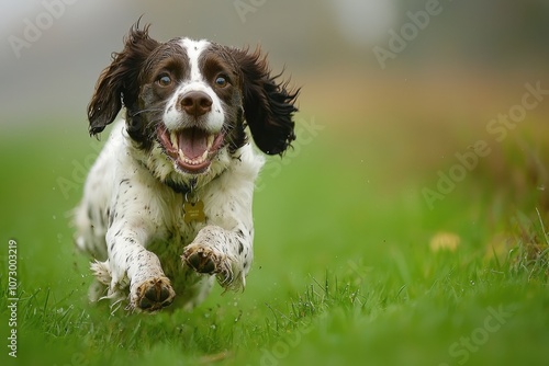 A playful dog chasing after a stick thrown into a grassy field.