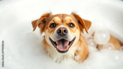 A playful dog enjoying a bubble bath, surrounded by foam and bubbles in a lighthearted moment.