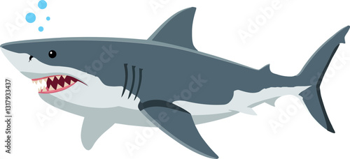 A playful grey shark swimming gracefully in a bright blue ocean with bubbles, showcasing a flat design style, vector illustration