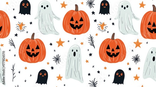A playful Halloween-themed pattern featuring pumpkins, ghosts, and stars in orange, black, and white colors.