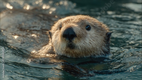 A playful otter swims gracefully in the calm waters of a serene lake, its face visible as it curiously observes its surroundings on a bright afternoon.