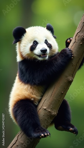 playful, endangered, dynamic, joyful, movement, black-and-white, fluffy, conservation, mammal, play, wildlife, zoo, china, fauna, adorable, hanging, habitat, vegetation, timberland, fun, happy, panda, climbing, active, wild, bamboo, cute, leaf, animal, branch, flora, green, nature, tree, park, asia, tree branch, forest, giant panda