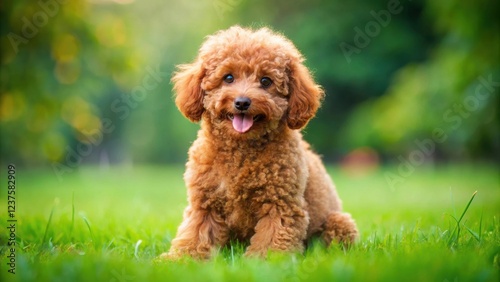 A playful red toy poodle puppy sitting on a lush green grass with its legs stretched out and tail wagging happily , pet, nature