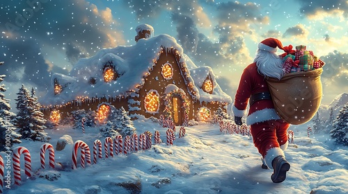 A playful Santa Claus walking up to a cozy gingerbread cottage, carrying a big sack of presents, with candy cane fences and glowing gumdrop lights, snow gently falling, cute cartoon style,