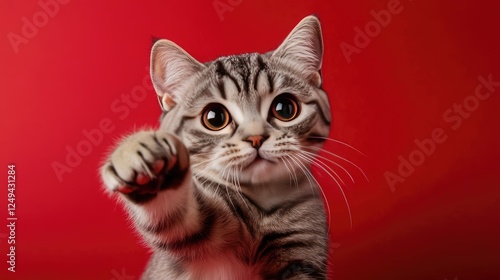 A playful Scottish Fold cat grinning while reaching out with a paw, set against a bold red background.