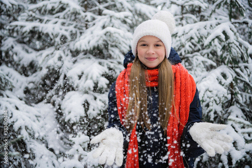 A playful teenage girl with a beautiful smile throws snow flakes and rejoices at the onset of the long-awaited winter