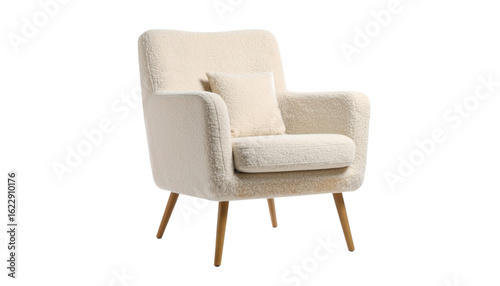 A plush cream-colored armchair with wooden legs, featuring a cozy design and a small cushion.