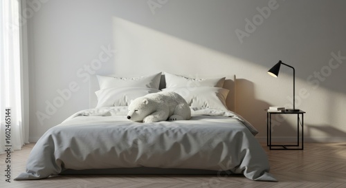bedchamber, plush, polar bear, sleep, bedding, white, minimalist, modern, interior design, soft light, morning, comfortable, relaxing, home decor, simplicity, clean, window light, bedside table, pillow, duvet, cosy, peaceful, serene, calm, relaxation, quiet, undisturbed, sunlight, indoor, furnished, bed, room, hotel, interior, pillow, home, furniture, luxury, lamp, design, apartment, headboard, blanket, house