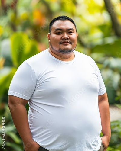 large size, t-shirt, fat, male, model, t-shirt, confident, white, shirt, lush, greenery, posing, fashion, nature, body, positivity, tropical, bright, colours, summer, style, casual attire, wear, lifestyle, portrait, smiling, comfortable, relaxed, personality, diversity, contemporary, stylish, vibrant, natural, light, trend, everyday, joyful, man, template, print, background, design