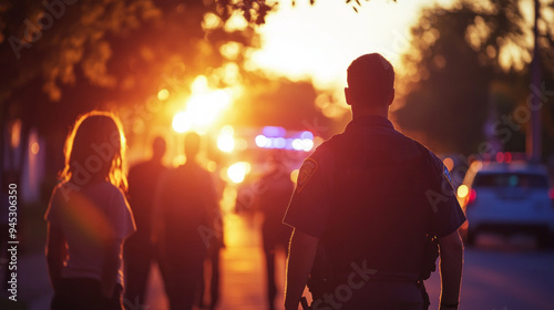 A police officer stands on a street with a group of people walking by