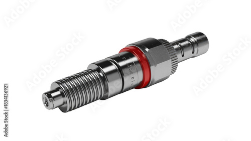 A polished silver threaded metal connector with a red band, likely for industrial or fluid applications, presented on a minimalist dark transparent background. background removed