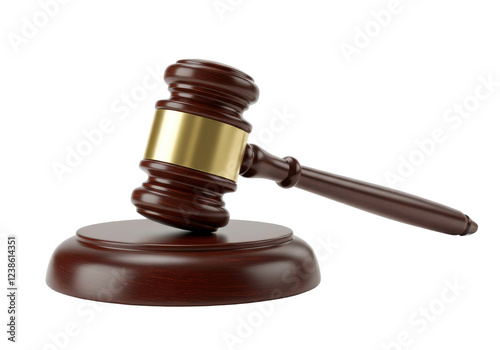A polished wooden gavel with a golden metal band, resting on its matching base, isolated on a white background