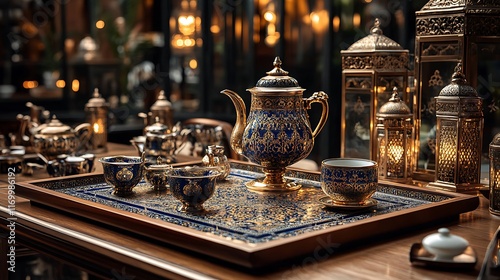 tray, wooden, polished, middle eastern, pattern, gold, blue, luxurious, lantern, tea, set, lighting, warm, moody, intricate, photorealistic, textured, artistic, opulent, refined, elegant, handcraft, inviting, aesthetic, vibrant, cultural, decorative, sophisticated, cosy, detailed