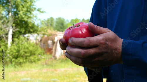 A portrait guy, a farmer in a straw hat, a working robe picks up a tomato in the garden (in the field) makes a bite and eats, after which he demonstrates a tomato and I raise my hands from the bottom