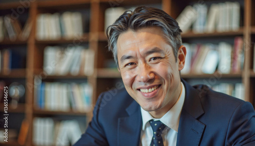 A portrait headshot photo of a friendly professional CEO executive business worker: A smiling, middle-aged Asian man in a suit sits confidently in front of a wall filled with books, suggesting in